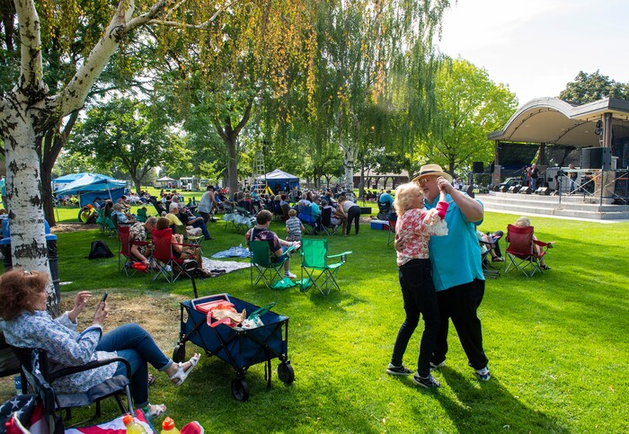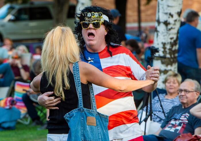 (Rick Egan | The Salt Lake Tribune) Tom and Carlene Cosgrove from West Jordan, dance to the music of Denovo, during the annual Geezer Fest 2020 in Orem on Friday, Aug. 14, 2020.