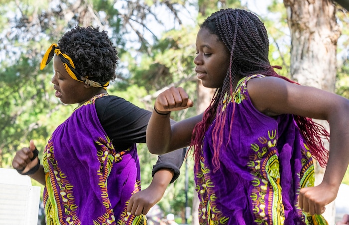 (Rick Egan | The Salt Lake Tribune) Maya Linton 11, Beatrice Burt, 13, perform with the Wa-Toto dancers perform at the 5th annual African Festival at Liberty Park, on Saturday, July 31, 2021.