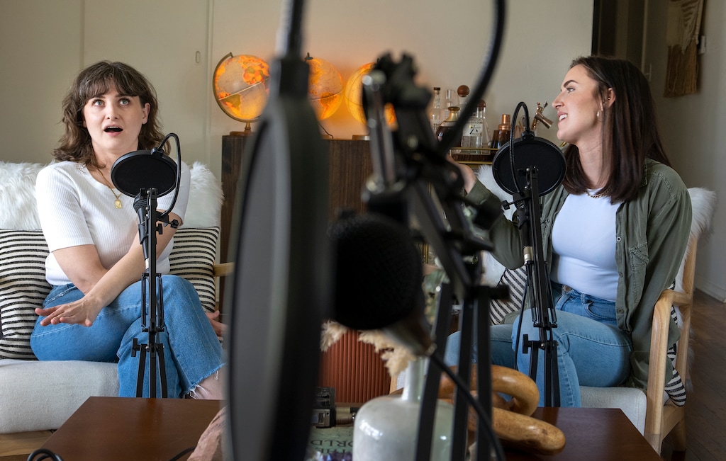 These are the staples of the studio — actually a Rose Park living room — where Lauren “Lo” Peterson and Elizabeth Leach record their podcast, “Other People’s Stories.” The guest sits on the couch, while the hosts sit in their two white armchairs.