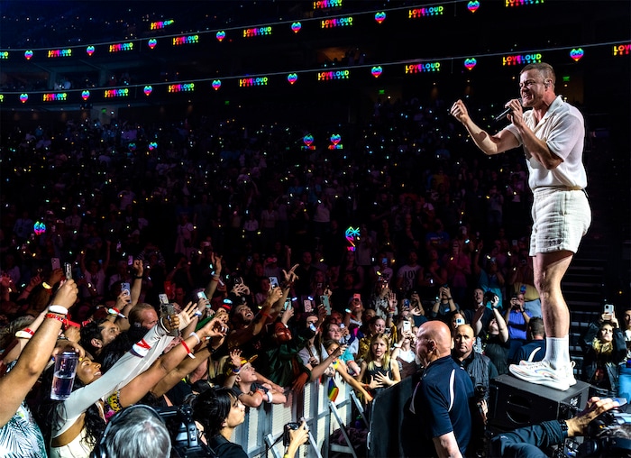 (Rick Egan | The Salt Lake Tribune) The crowd joins in as Dan Reynolds sings Bob Marley's "Three Little Birds" as he performs at the LoveLoud Festival at Vivint Arena, on Saturday, May 14, 2022.