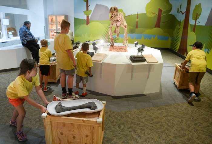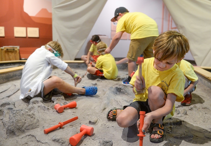(Chris Samuels | The Salt Lake Tribune) Children transport replica dinosaur bones to be assembled and examined at the "I Dig Dinos" exhibit at Discovery Gateway Children’s Museum in Salt Lake City, Tuesday, July 12, 2022.