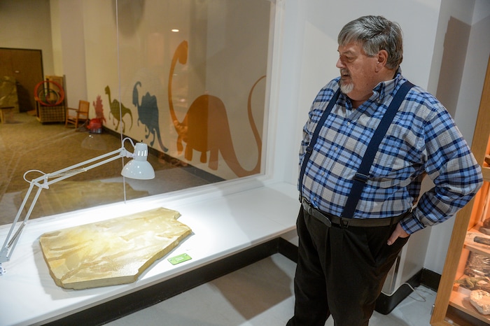 In the exhibit, he points out a rock that is 240 million years old. It came out of Sardine Pass in 1990, from blasting done when crews were widening the road. He points out small details in the fossils in that rock — like bird tracks — that people might miss without a microscope and experience.