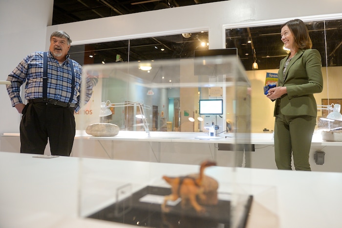 (Chris Samuels | The Salt Lake Tribune) Paleontologist Joe Dabelko, left, and Kathleen Bodenlos, Discovery Gateway Children’s Museum executive director, talk about the "I Dig Dinos" exhibit at the museum in Salt Lake City, Tuesday, July 12, 2022. Dabelko donated the majority of the fossils for the exhibit.