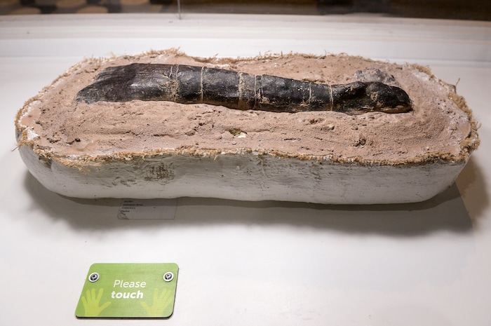 Interactivity was the goal for the exhibit, Bodenlos said. Throughout the exhibit, signs are posted encouraging children to “please touch” certain fossils. The language is straightforward, telling children they can look at the fossils they dug up under the microscope.