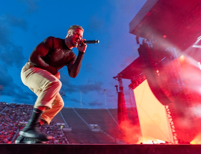 (Rick Egan | The Salt Lake Tribune) Dan Reynolds performs with Imagine Dragons, at Rice-Eccles Stadium, on Friday, Aug. 5, 2022.