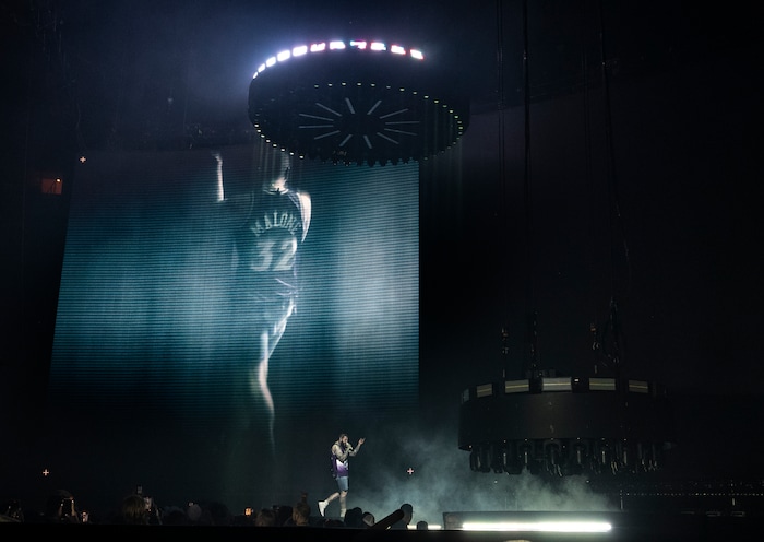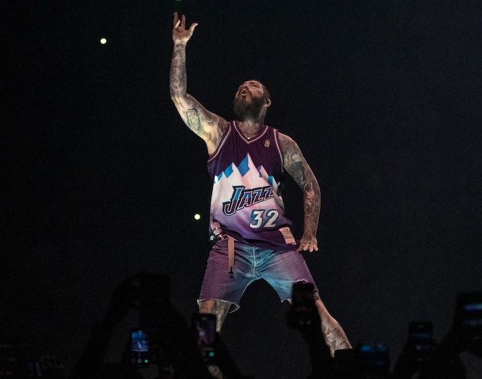 Malone wore a ‘90s replica Utah Jazz jersey, paying tribute to his namesake, NBA Hall of Famer Karl Malone, whose name and number hang in the arena’s rafters. Karl Malone himself was in attendance, cheering the rapper on, in a moment captured by the arena’s social media team.