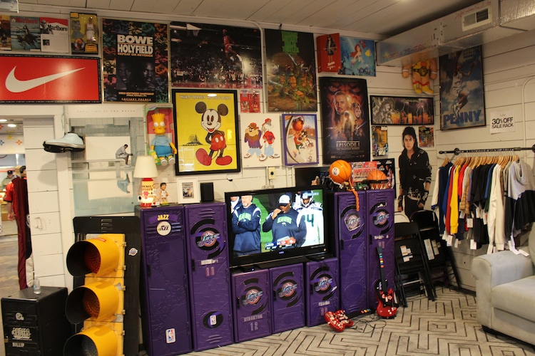 There’s plenty of clothing to browse, though, from corduroy button-down shirts to classic streetwear to racks of sports jerseys. There’s also a lit-up display of sneakers, to complete your ’90s look.