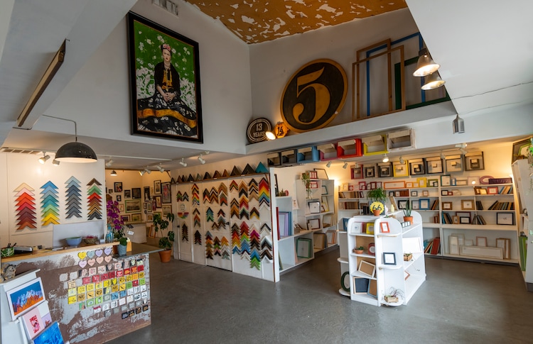 The front of Signed & Numbered is a small retail space, filled with ready-made wooden frames of all sizes, prints from Bell and other artists, consigned art, and frame samples in case you want to order something custom.