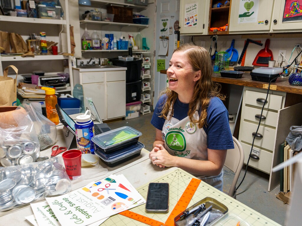 The supplies at Clever Cucumber come from Jarman-Gates’ time as a teacher, along with stuff donated from the community, and sometimes items she buys herself. People often call to donate unwanted art supplies they found in their basements. A red cart that holds some of their heavy-duty wood tools has “Mrs. Gates” written on it in black Sharpie.