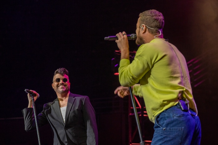(Rick Egan | The Salt Lake Tribune) Tyler Glenn sings a song with Dan Reynolds, at Loveloud at the Delta Center, on Friday, Nov. 3, 2023.