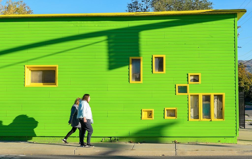 The purported mystery — as described in online chatter — is that no one sees children go into the distinctively painted building on the corner of 1300 South and 300 East, or play on its small playground. The curious drive by, trying to see as much as they can, or walk past, trying to peek around tattered paper that covers up its many tiny windows. They make TikToks about it, immortalize its facade in artwork (here, too), and even make Halloween costumes that pay homage to it.