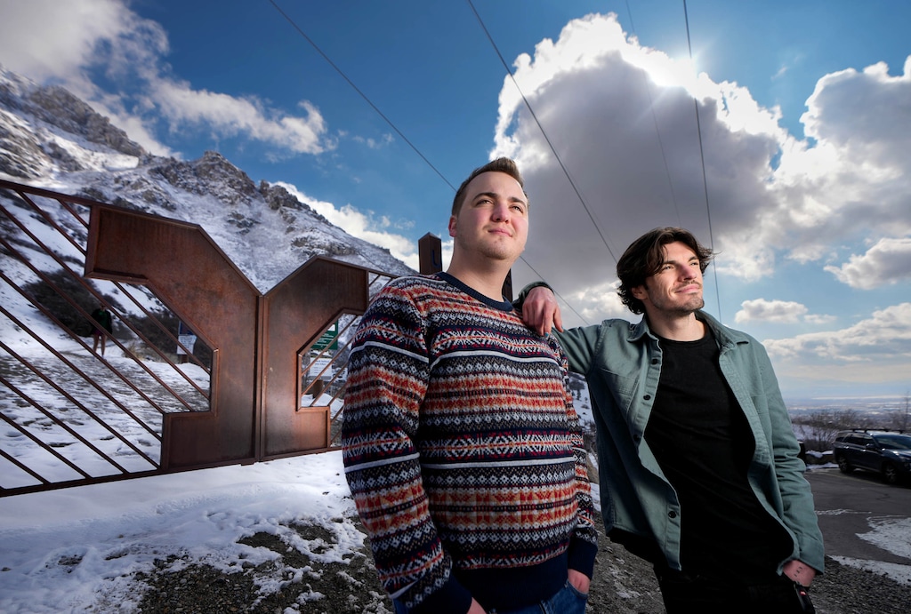 (Francisco Kjolseth | The Salt Lake Tribune) Former BYU student David Sant, left, and former UVU student Tayler Pace, visit the statue of Brigham Young on campus as they reflect on their recently finished documentary about the experience of LGBTQ students at BYU and of the lighting of the Y on the hillside above campus on Saturday, Feb. 10, 2024.