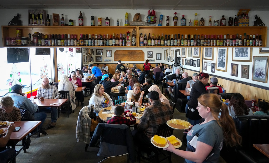 Servers crisscrossed the restaurant, filling mugs and taking orders, passing below a long shelf filled with bottles of hot sauce.