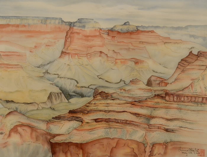 (Francisco Kjolseth | The Salt Lake Tribune) The Utah Museum of Fine Art hosts "Chiura Obata: An American Modern," major touring retrospective of Japanese-American artist (1885-1975), whose work captured Western landscapes and his time at the Topaz War Relocation Center (internment camp) during World War II. Exhibit opens Friday, May 25. Pictured is Grand Canyon, May 15, 1940, Watercolor on silk.