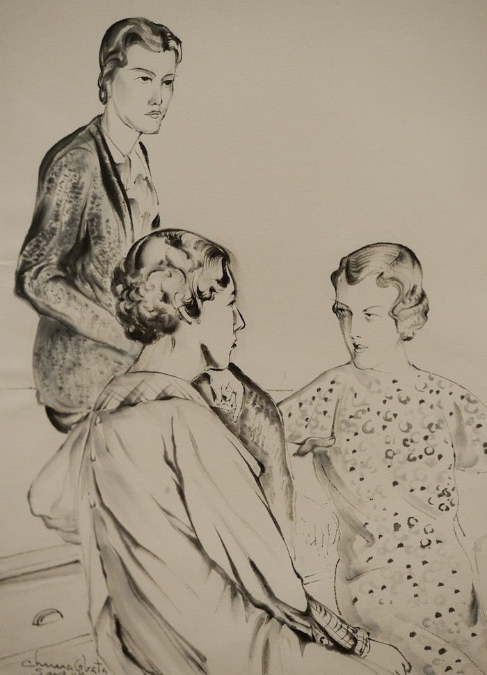 (Francisco Kjolseth | The Salt Lake Tribune) The Utah Museum of Fine Art hosts "Chiura Obata: An American Modern," major touring retrospective of Japanese-American artist (1885-1975), whose work captured Western landscapes and his time at the Topaz War Relocation Center (internment camp) during World War II. Exhibit opens Friday, May 25. Pictured is Untitled (Three students), September 7, 1934, Ink on paper.
