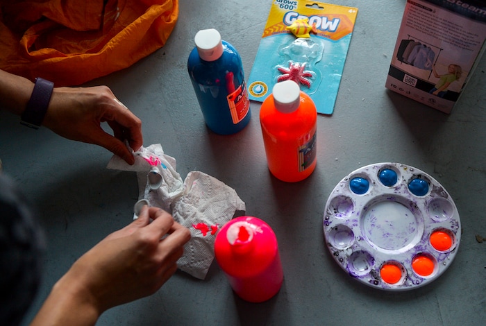 Leah Hogsten | The Salt Lake Tribune Cait Lee, her sister Mika Lee and their friends work with glow in the dark paint, iridescent objects, mirrors and black lights to create the scene of sea creatures flying through space at a vacant store in Gateway, April 12, 2019 as part of the Art Shop Project. The Art Shop Project at The Gateway was created to re-purpose and decorate vacant store windows with temporary art installations from local artists and students.