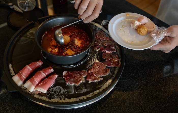 If you’ve never been to a hot pot or Korean barbecue-type grill, don’t stress, the servers will explain everything — from which refrigerated glass case contains ingredients for the hot pot, the grill or both, to how to use the many tools on your table and the pricing (per plate or bowl).