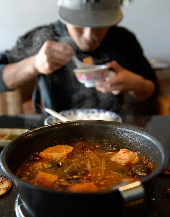 (Francisco Kjolseth | The Salt Lake Tribune) Kayle Sumida, owner of Yeah Hot Pot & Grill in West Jordan, assembles a hot and sour soup with white fish, noodles, mushrooms and bok choy.