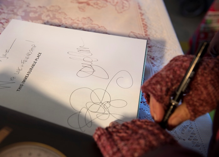 (Scott Sommerdorf | The Salt Lake Tribune) Blake Spalding, co-owner of Hell's Backbone Grill in Boulder, signs a copy of the new cookbook, "This Immeasurable Place: Food and Farming from the Edge of Wilderness," on Dec. 9, 2017.