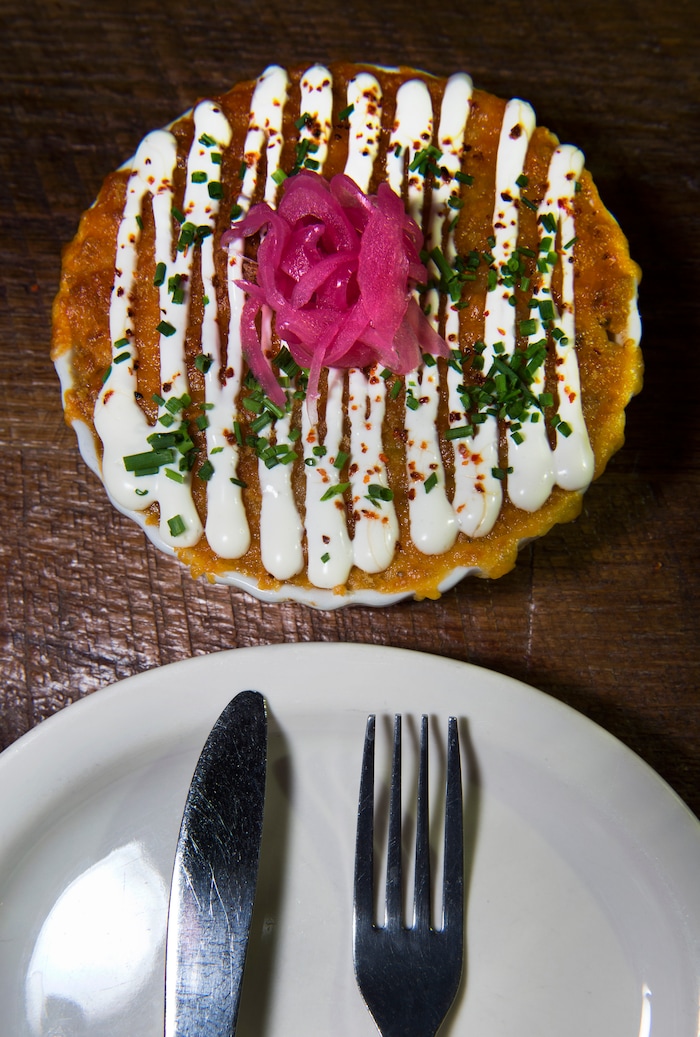 Fries are a quintessential bar food, but at Purgatory they come in all sorts of playful iterations thanks to the use of such ingredients as caramelized kimchi or jalapeño. The Japanese version ($7) is seasoned with dashi, slathered with that shiso-spiked cream sauce and garnished with fish roe. Despite that load, the fries were crisp without being greasy.