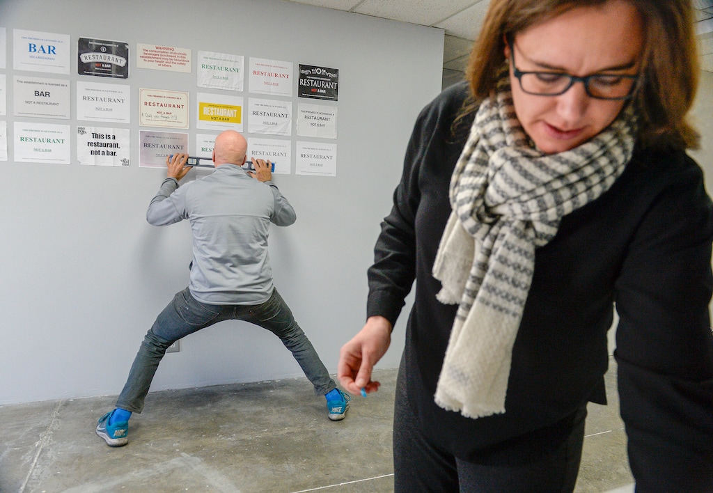 Leah Hogsten | The Salt Lake Tribune Salt Lake City liquor attorney, Tanner Lenart and Nox Contemporary art gallery owner, John Sproul, tack the ill-fated artistic memorials of Utah’s now defunct liquor law on the walls of Sproul's gallery. The opening reception for the installation is Friday, November 16th and runs thru the end of November. Last May, the state law requiring restaurants and bars to display DABC signs labeling themselves as a “bar” or a “restaurant” was repealed. Once a perceived nuisance by restauranteurs, the signs are celebrated art. The installation "This is Art, Not a Sign," is a collage made of "This is a Restaurant, Not a Bar" liquor signs that were once required in Utah restaurants.