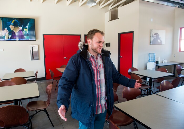 The building has garage doors that can remain closed in winter but will open in good weather. They connect to a covered outdoor patio that will offer shade in the scorching summer heat. There also is a grassy area with tables and chairs and eventually benches.