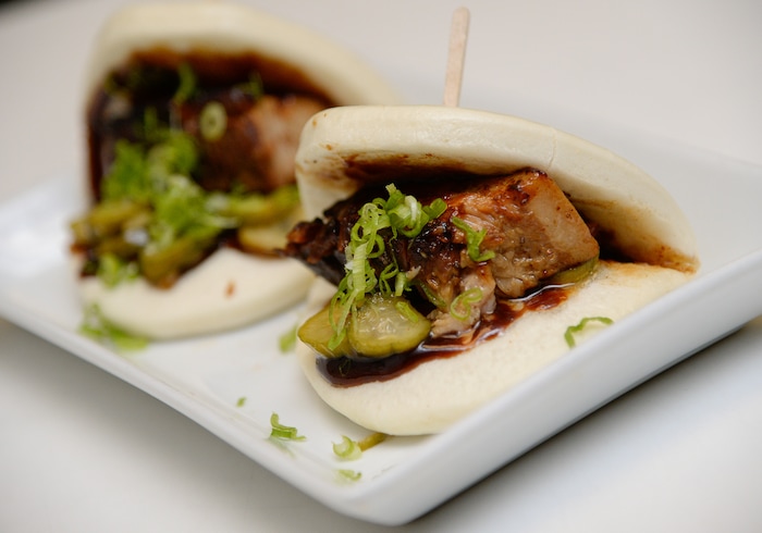 On the starter menu, four flavors of Korean spicy fried wings ($11.99 or $13.99), steamed buns and L.A. Kalbi were all finger-licking good — if not for the price. A smallish soft-shell crab steamed bun will set you back $13.99, although the luscious pork belly buns were worth every penny of the $8.99 price tag.