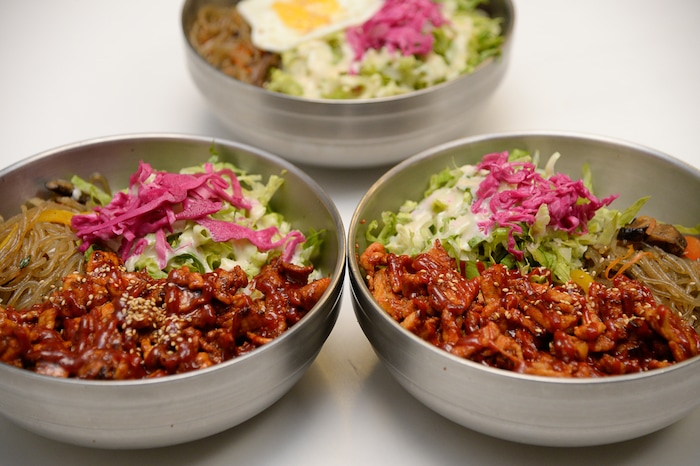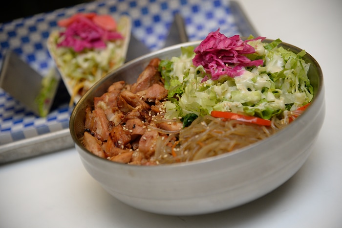 Guests can get their fill of bibimbap — Korean rice bowls — featuring all of the protein choices available on the tacos in addition to spicy chicken ($14.99), salmon ($15.99) marinated in sweet soy, or an 8-ounce New York strip steak ($15.99).