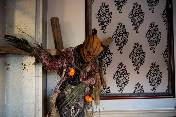 Jimmy Dilley, the creative director at Nightmare on 13th, and his team have decorated the hotel’s Vault Bar with ghoulish props — cobwebs, gargoyles, Frankenstein’s monster and scarecrows with hair-raising pumpkin heads.