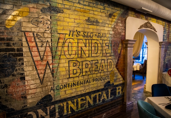 The remodel included touching up and removing chicken wire from an aging Wonder Bread mural painted on the exposed brick wall that divides the bar and dining rooms. The Mirendas also hung a 10,000-plus piece tile mosaic featuring newlyweds, and added tufted blue and gray accent chairs and Venetian glasses for a modern, but elegant vibe.