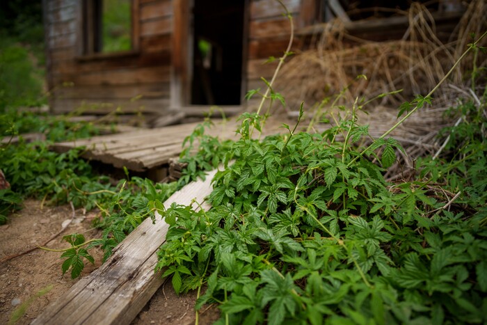 Outside a crumbling cement building — likely the assay office, where ore was weighed and priced — and a collapsing wooden bunkhouse, Willard pointed out the plant everyone had come to see: Humulus lupulus, or wild hops. In early June, they’re all stem and leaves, and look a little like unassuming yard shrubs.