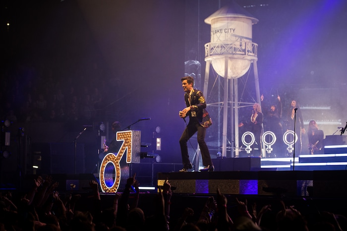 Brandon Flowers, frontman of alt-rock/synth-pop band The Killers, opened and closed Tuesday night’s concert at Vivint Smart Home Arena in Salt Lake City by noting that the band had originated from “fabulous Las Vegas.”