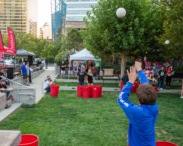 (Rachel Molenda | The Salt Lake Tribune) Concertgoers play a giant game of beer pong at the Twilight Concert Series in downtown Salt Lake City on Thursday, Sept. 6, 2018.
