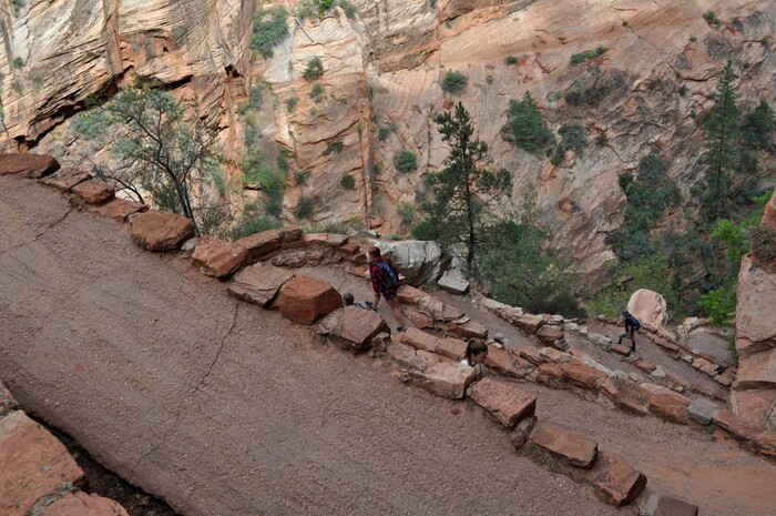 At 1.75 miles, the trail straightens and levels a bit as it heads south. There are some buildings and an open, gravelly area. This is where you branch off the main West Rim Trail to go south to Angel's Landing. If you are uncomfortable with heights, definitely stop here. The last half mile takes you over a knife-edge ridge with steep drop-offs on either side. There are steep climbs, occasional scrambling, and it's often crowded, which poses its own dangers as you shinny around your fellow visitors to reach the chain railings nailed to the rock. The narrow ridge broadens at Angels Landing itself, giving ample room to sit in peace and enjoy a magnificent panorama of Zion Canyon.