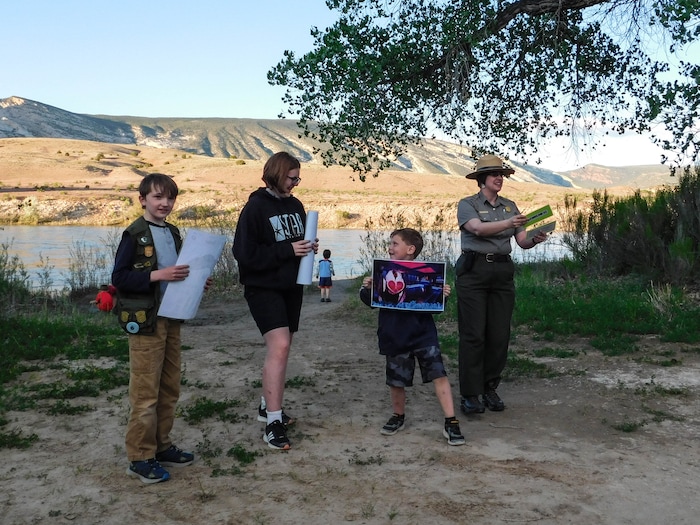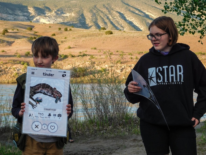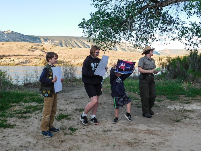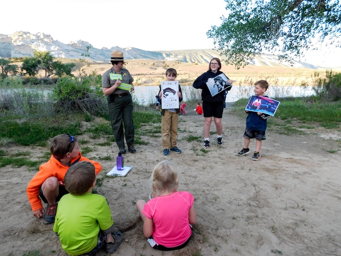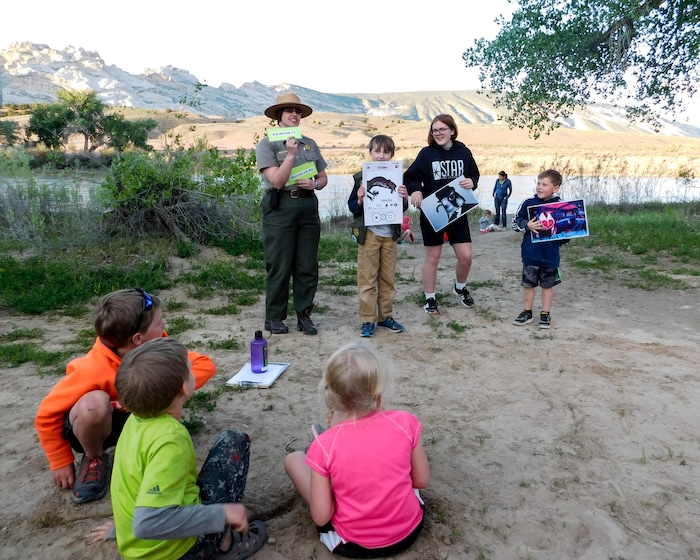 At a nighttime campground program, kids got up to perform a lek or courtship dance, while ranger Kelsey Isom (married to John) directed a "dating game" involving the birds of Dinosaur — and one mystery suitor saurischian (lizard-hipped dinosaur) behind a poster with a question mark.