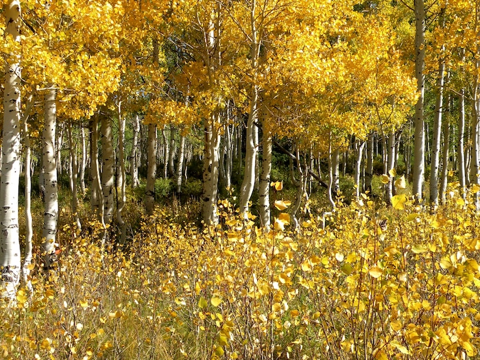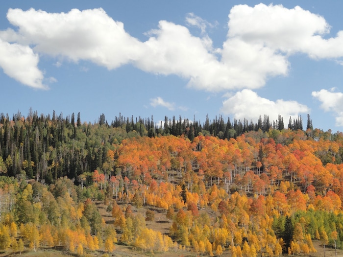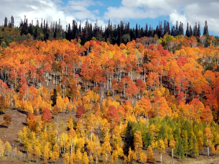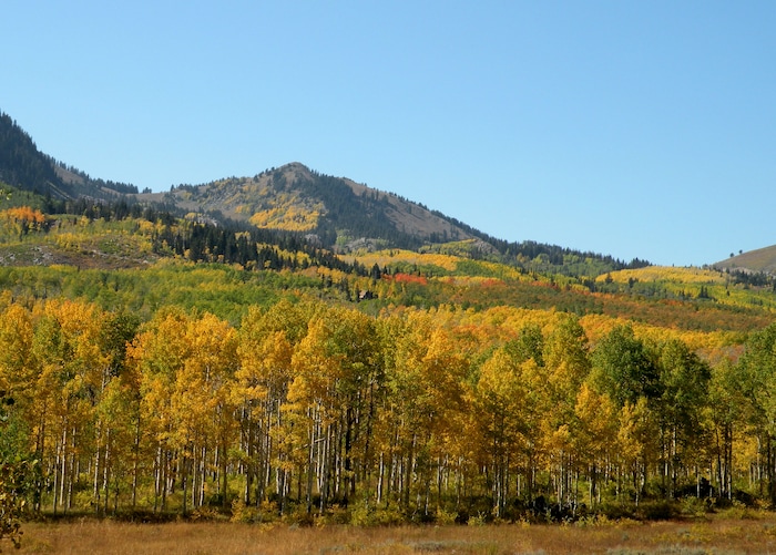 (Courtesy U.S. Forest Service) Aspen display full fall colors September 30, 2011 on the east side of Monroe Mountain, above the community of Greenwich, Utah, in the Fishlake National Forest. Photo by John Zapell.