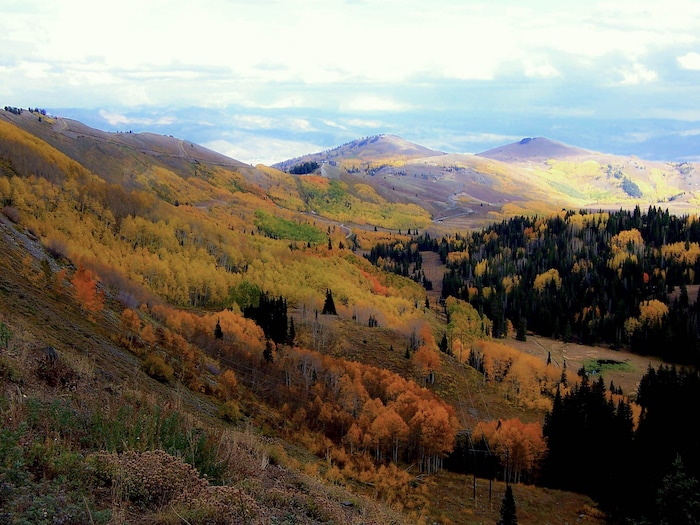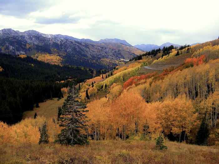 (Erin Alberty | The Salt Lake Tribune) Patches of orange and forest green cover Big Cottonwood Canyon below Guardsman Pass.