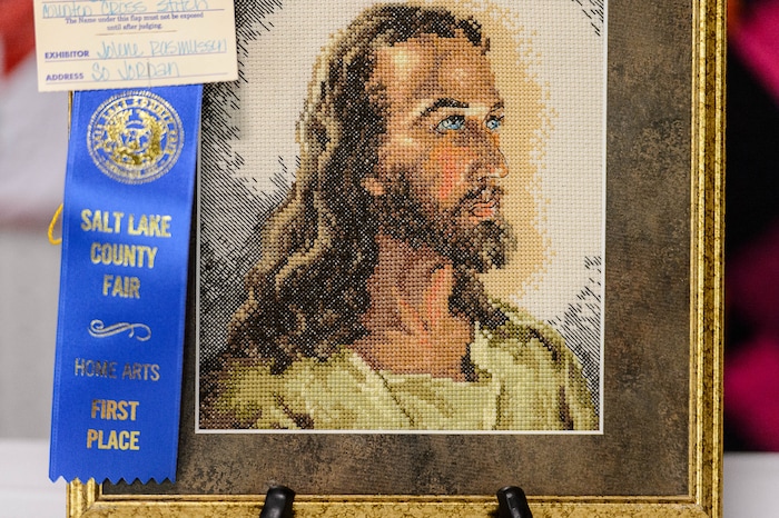 (Trent Nelson | The Salt Lake Tribune) Jesus, a first place cross stitch by Jolene Rasmussen, at the Salt Lake County Fair, which opened in South Jordan Wednesday August 2, 2017.