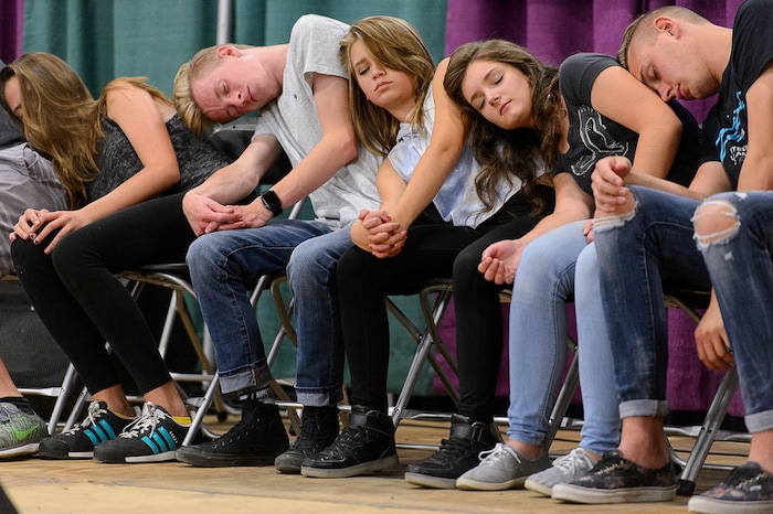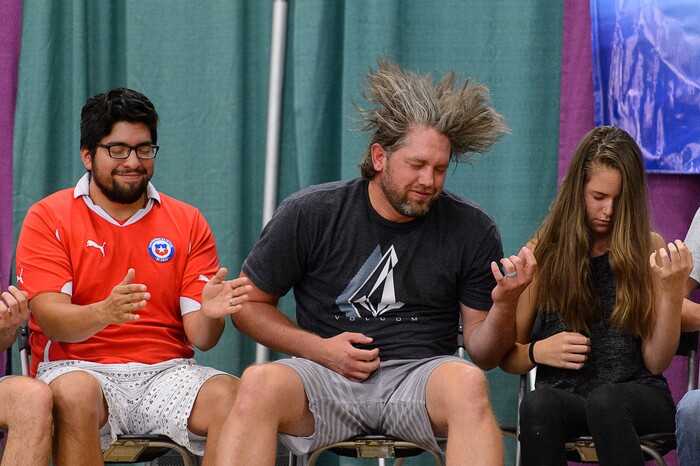 (Trent Nelson | The Salt Lake Tribune) Volunteers from the crowd at rest during a show by hypnotist Shaun Dee the Hypno Hick at the Salt Lake County Fair, which opened in South Jordan Wednesday August 2, 2017.