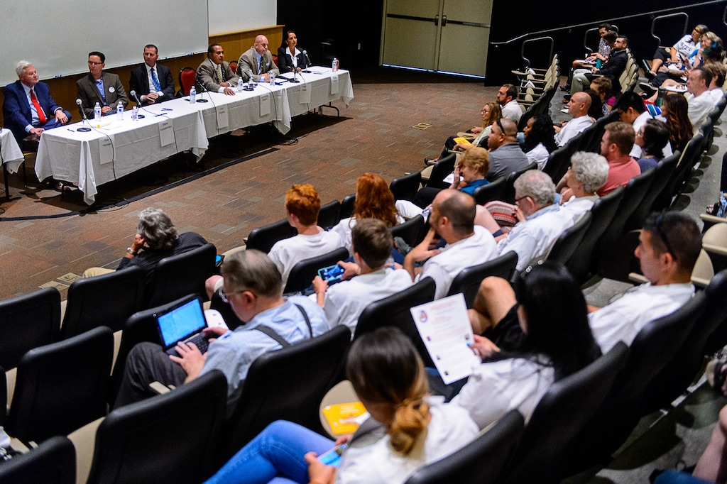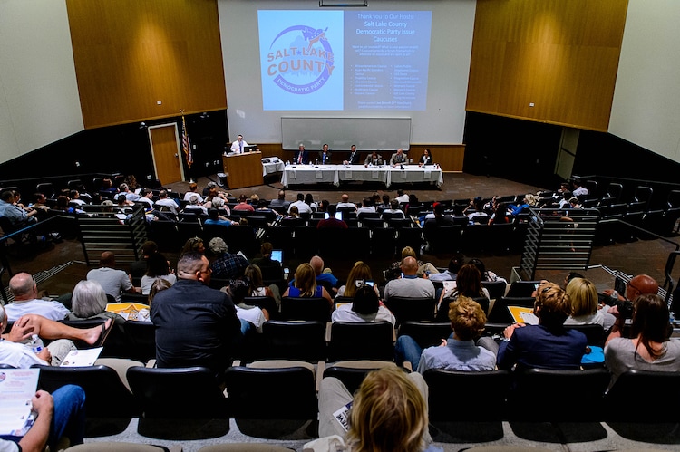 More than 100 members of the Central Committee packed an auditorium at Salt Lake Community in Sandy to ask the candidates questions generated by its various caucuses.