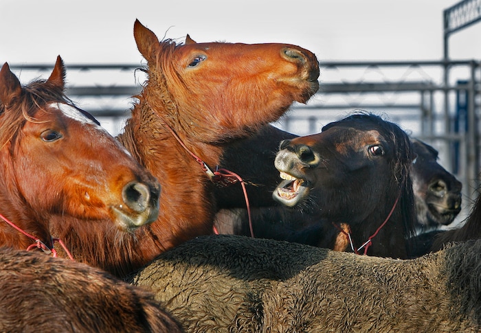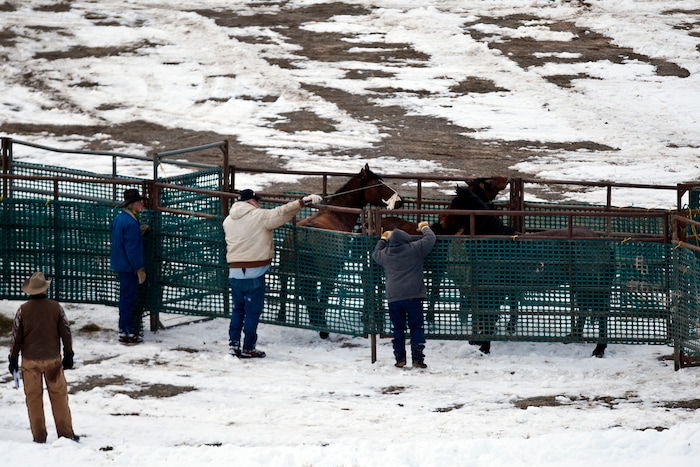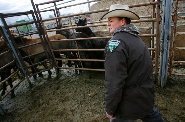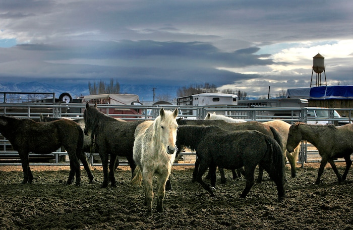 (Scott Sommerdorf | Tribunefile photo) A group of wild horses stand in pens as they await adoption. The Bureau of Land Management holds a wild horse adoption Saturday, January 24, 2009, in Delta.