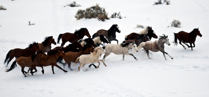 (Chris Detrick | Tribune file photo) Wild horses from Utahs Swasey herd are rounded up by Cattoor Livestock Roundup Co in the West Desert near the Swasey Mountains Thursday February 14, 2013. Under the Bureau of Land Management operation 50 miles west of Delta, helicopter wranglers gathered 262 horses. One hundred will be released back into the Swasey Herd Management Area one of Utahs 19 HMAs on federal land. Many of the horses released will be mares treated with the contraceptive Porcine Zona Pellucida (PZP-22).