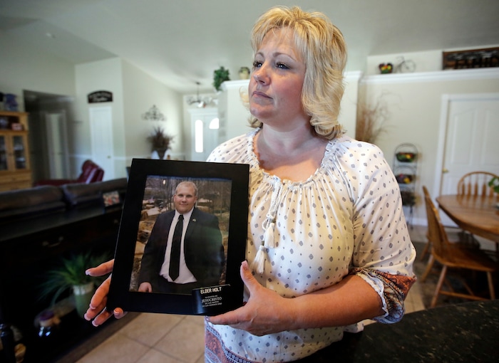 FILE - This July 13, 2016, file photo, Laurie Holt holds a photograph of her son Josh Holt at her home in Riverton, Utah. Venezuelan authorities on Wednesday, July 20, 2016, presented what they said are new details in the case against Josh Holt being held on weapons charges. Holt traveled to Venezuela last month on a tourist visa to marry a fellow Mormon he met on the internet. At the time of the arrest June 30, Holt's new wife, Thamara Caleno, was waiting for a U.S. visa so the pair could travel to his home in a suburb of Salt Lake City. (AP Photo/Rick Bowmer, File)
