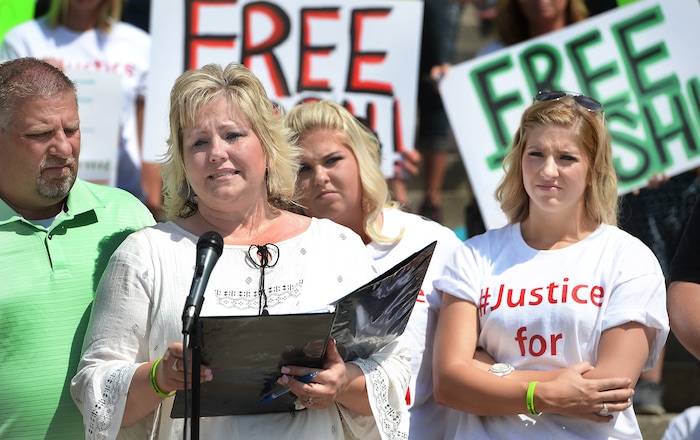 Laurie Holt, Josh Holt's mother speaks at a rally on the east steps of the Utah State Capitol calling for the release of her 24-year-old son Josh Holt, who is currently jailed in Venezuela, Saturday, July 30, 2016. At left is her husband Jason Holt, with Josh's sisters Katie, and Jenna Holt, far right.