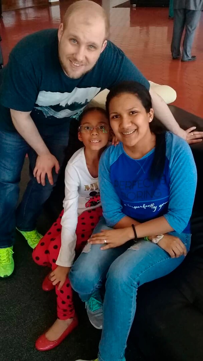 (Holt family photo via AP) In this image provided by the Holt family, Joshua Holt poses for a photo with his wife, Thamara, and her daughter, at the airport in Caracas, Venezuela, Saturday, May 26, 2018. Jailed in Venezuela on weapons charges nearly two years ago, Holt was released Saturday after a U.S. senator pressed for his freedom in a surprise meeting with President Nicolas Maduro. Holt and his wife, who also jailed, were reunited with her daughter from a previous relationship at Caracas’ airport where the three boarded a chartered flight to Washington.