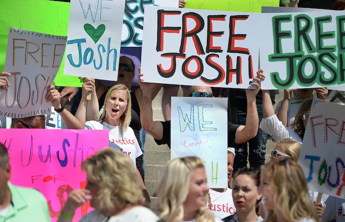 A crowd of friends and family shout "Bring Home Josh!" at the end of a rally on the east steps of the Utah State Capitol for 24-year-old Josh Holt, who is currently jailed in Venezuela, Saturday, July 30, 2016.