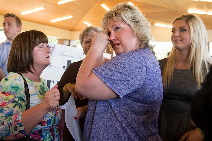 Josh Holt's mother Laurie Holt hugs her uncle Leonard Bell after a rally on the east steps of the Utah State Capitol that called for the release of their 24-year-old son Josh Holt, who is currently jailed in Venezuela, Saturday, July 30, 2016.