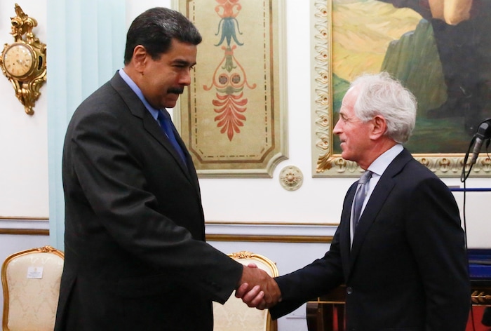 (Miraflores Presidential Press Office via AP) In this photo released by the Miraflores Presidential Press Office, Venezuela's President Nicolas Maduro, left, shakes hands with Republican Senator Bob Corker during a meeting at the Miraflores Presidential Palace in Caracas, Venezuela, Friday May 25, 2018. The Chairman of Senate Foreign Relations Committee met with Venezuelan President Nicolas Maduro two days after the embattled socialist leader kicked out the top U.S. diplomat in the country. There was no immediate comment from Republican Senator Bob Corker's office about the nature of the surprise visit.