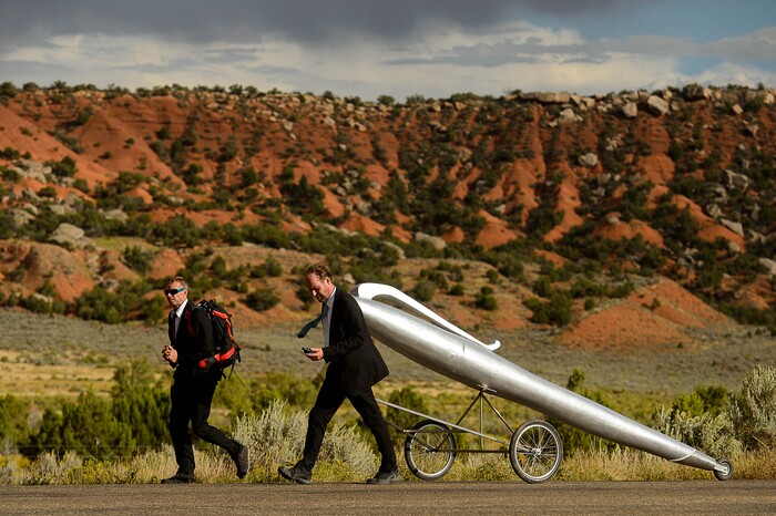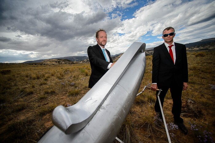 (Trent Nelson | The Salt Lake Tribune) German artists Wolfgang Aichner and Thomas Huber on the first day of their art project, Linear, about ten miles northwest of Vernal Wednesday September 13, 2017. The duo are launching a four-week long performance art project in which they are filming themselves dragging an oversized giant silver pen through a 250-mile rectangular through the deserts of Utah, Wyoming and Colorado.