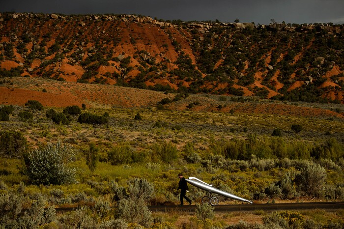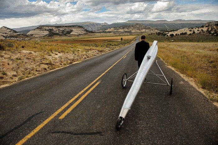(Trent Nelson | The Salt Lake Tribune) German artists Wolfgang Aichner (pictured) and Thomas Huber on the first day of their art project, Linear, about ten miles northwest of Vernal Wednesday September 13, 2017. The duo are launching a four-week long performance art project in which they are filming themselves dragging an oversized giant silver pen through a 250-mile rectangular through the deserts of Utah, Wyoming and Colorado.